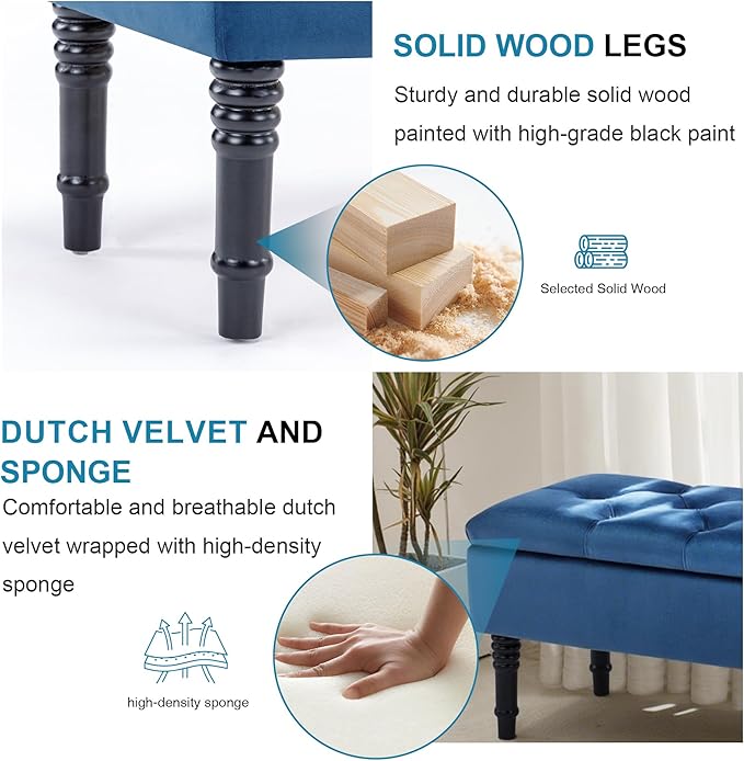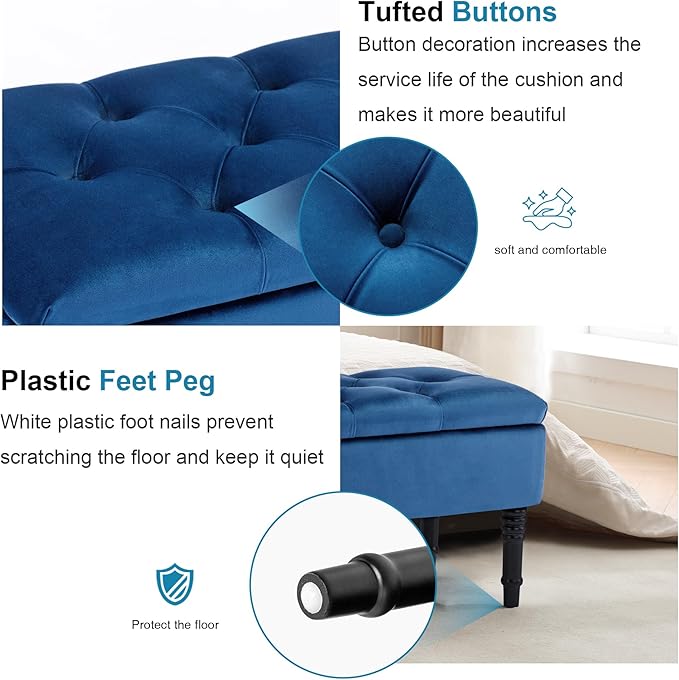 Ottoman with Storage Velvet Storage Bench Holds Up to 500 lbs Ottomans Upholstered Bench with Seating for Bedroom, Living Room, Blue