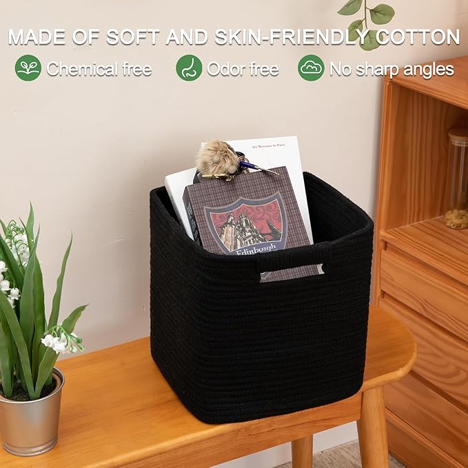 OIAHOMY Storage Cubes 11 Inch Storage Bins-3-Pack, Cotton Rope Woven Baskets for Organizing, Square Storage Baskets for Shelves Organizer, Classroom, Kids Toy Bins, Closet, Baby Nursery-Black