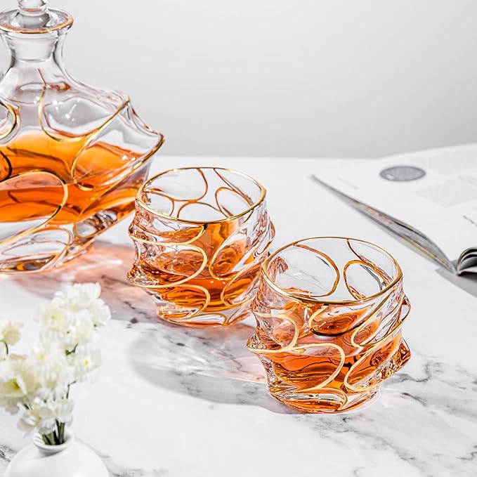 - Unique 24k Gold Plated: Look and feel luxurious. You are not going to find a more stylish old fashion whiskey glasses. Practical to Make an Impression on Guests with 2 Scotch glasses in unique luxury Style. Elegant, handcrafted barware glasses set comes coordinating double old-fashioned tumblers, allowing you to recreate your favourite movie scene. For all they know, you could be serving them your finest liquor! Create the ideal atmosphere at your home, workplace, man cave, James Bond hideaway, or bar.