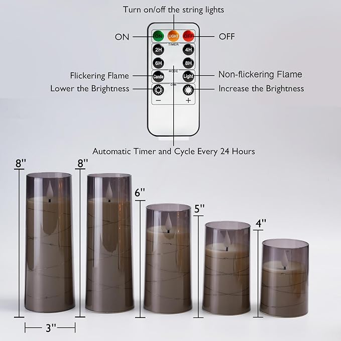Homemory Flameless Candles with Embedded Star String Fairy Lights, Battery Operated Candles, LED Candle, Fake Candles with Remote Control and Timer for Halloween, Gray Acrylic, Set of 5(H4"5"6"8"8")