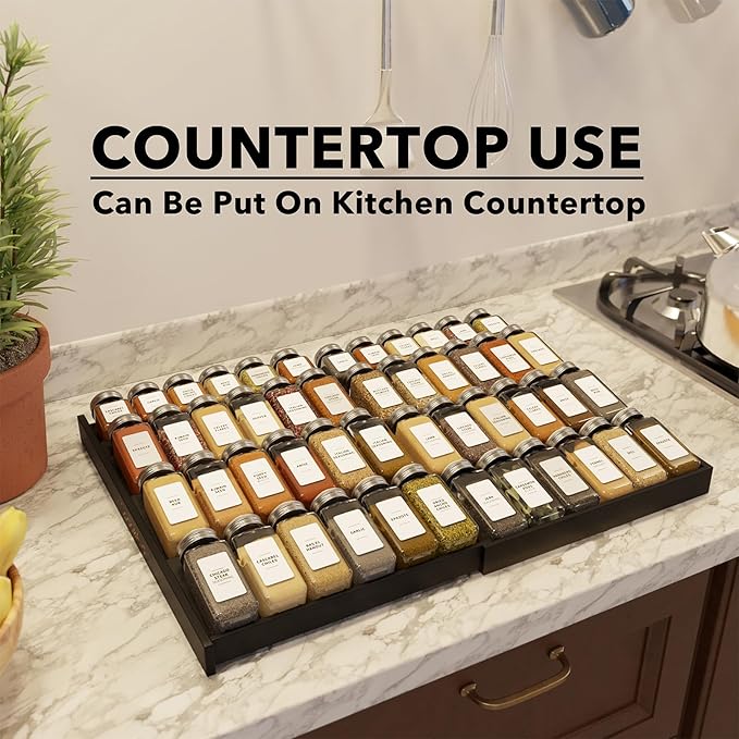 - EXPANDABLE DRAWER INSERT - The wooden spice rack is expandable from 12" to 23" wide, to fit in different sizes drawers