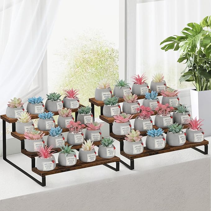 - Convenient Design: The stepped design makes efficient use of your counter space. This wooden display riser is a great idea for displaying toy figurines in cabinets, celebrating party desserts, and cosmetics on the dresser. The raised tiers help to create an eye-catching feature for your items.