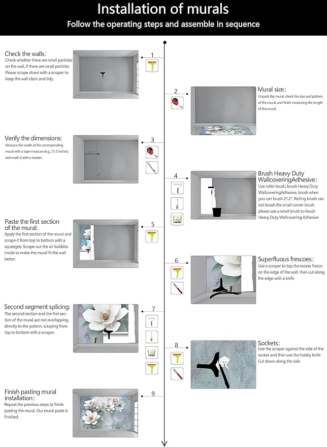 - Construction Installation: Each part of the mural is marked with a serial number underneath, no overlap, direct docking, in order. (Please refer to installation instructions)