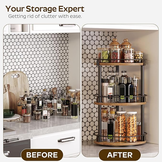 - Capacious Space: Sizing 10.2"L x 10.2"W x 18"H, this lazy susan organizer is divided into 3 layers for layered and partitioned storage to help eliminate clutter. 7.5" layer spacing design facilitates accommodating bottles of different heights