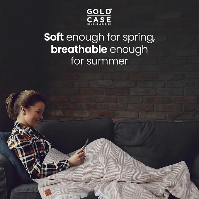 Gold Case Throw Blanket for Bed – 100% Recycled Turkish Cotton Bed Blanket – Decorative Throw Cotton Blankets for Living Room & Bedroom – Elegant Grey Woven Queen Blankets – 90x90