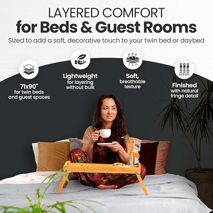 - VERSATILE STYLE FOR ANY SPACE: This breathable cotton lightweight blanket adds a relaxed touch to your bed, sofa or picnic setup; the vintage fringe design makes it easy to layer or display indoors and out
