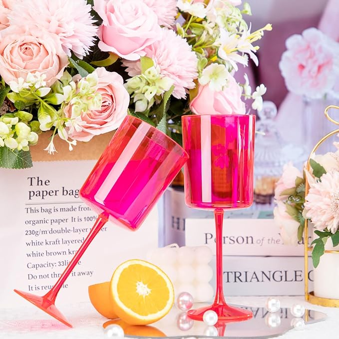 - The Perfect Gift: These hot Pink Plastic Wine Glasses are sophisticated, glamorous and luxurious. They will make a unique gift that your family and friends are guaranteed to impress! Celebrate life's most memorable moments with a disposable wine glasses for parties - weddings, anniversaries, mother's day, a costume reception or an engagement party that will surprise you beyond your wildest expectations.