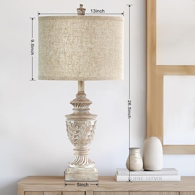 - 【RETRO FARMHOUSE RUSTIC TABLE LAMPS SET OF 2】This living room lamps set of 2 is hand-crafted oak's leafwork texture from vintage charm washed white resin, and this 27" tall table lamp is topped with an elegant oatmeal linen lampshade make the light bright enough without glare, which can effectively relieve eye fatigue and protect eyes. A decorative finial of farmhouse-style nightstand lamps set of 2 adds a aesthetic decor with beautiful soft ambient light to your living room, bedroom, office