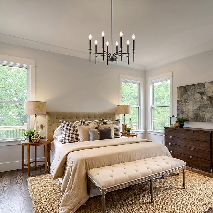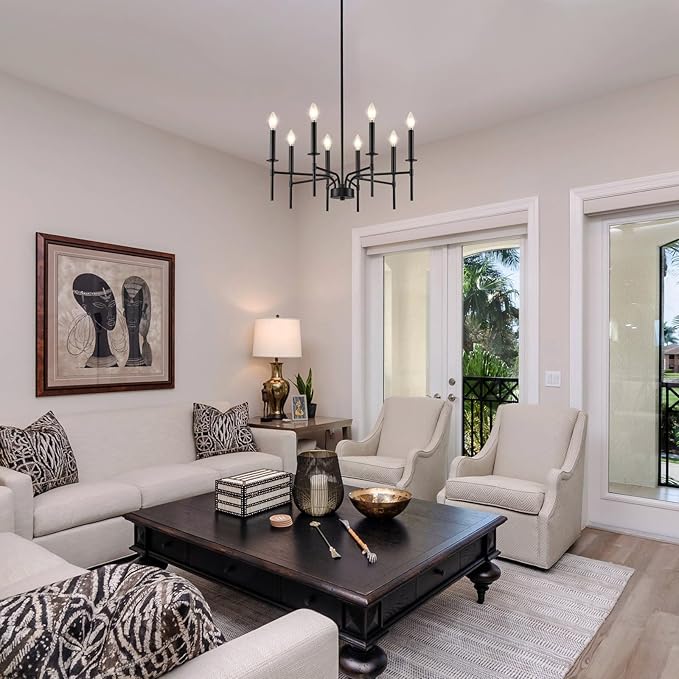 - Dimmable and E12 Bulb Compatibility: With 8 E12 candelabra sockets, this black chandelier is compatible with various E12 bulbs (incandescent, LED, CFL, and halogen, 40W MAX / bulb), offering dimmable functionality to create the perfect ambiance. This black matte chandelier allows for flexible lighting control, making it suitable as a black chandeliers for dining room, or master bedroom chandelier (NOTE: bulbs and dimmer are NOT included)