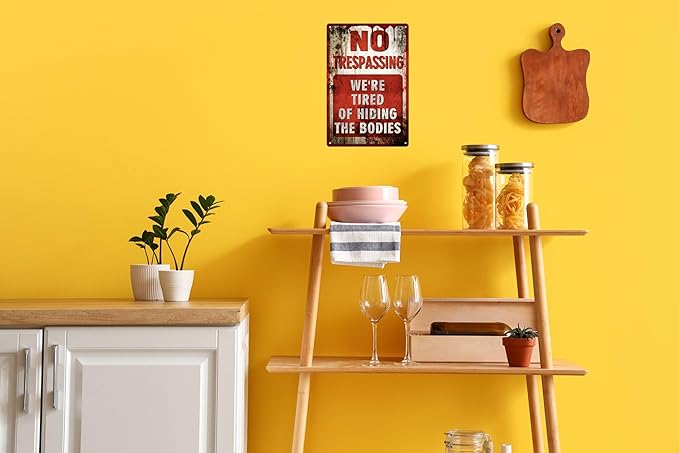 Vintage Tin Sign Retro Metal Funny No Trespassing Signs for Home Decor Stylish Wall Art Plaques Gift for Bathroom Kitchen and Gothic Wall Decor in Every Room 12x8 in
