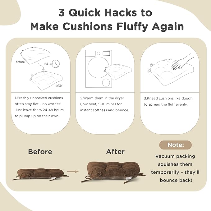 - Enhanced Support & Premium Filling: Our dining room chair cushions offer double the comfort with high quality cotton filling that offers superior comfort and support, relieving pressure on your hips and tailbone during extended seating. The chair cushions are tufted to prevent foam clumping. Perfect for extended sitting whether at the desk or dining table it combines comfort with ergonomic support.