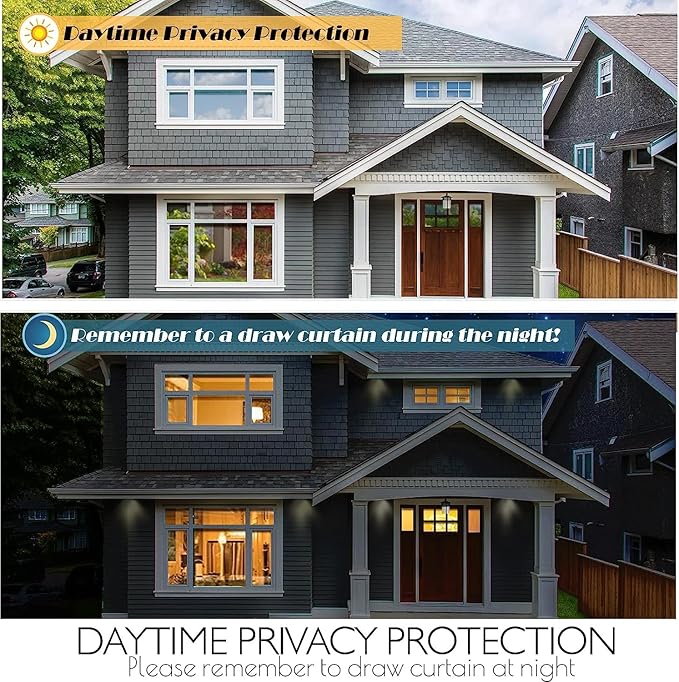 - SUPERIOR DAYTIME PRIVACY PROTECTION – Applying our window privacy film see out not in lets you see out and does not let prying eyes see in during daytime while letting natural lights in, and from the outside, the glass shows a mirror like reflective surface. NOTICE: When the inside light is stronger than the outside light at night, the house window tint CANNOT provide privacy, and the mirror reflective effect will disappear. Do remember to draw the curtains during the night.