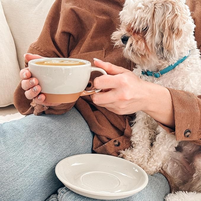 Mora Ceramic Latte Art Mug With Saucer - 10.5 oz, Round Bottom For Perfect Pours - Cafe Cups for Cappuccino, Espresso, Coffee, Tea etc - Porcelain Set for Baristas, Great Gift - Earl Grey