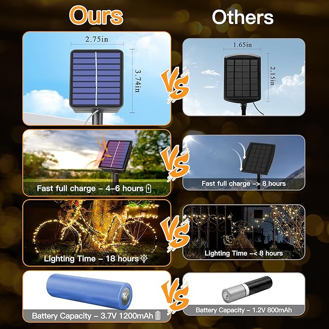 - 【Fast Charging Long Lasting】The outdoor string lights equipped with an1200mAh rechargeable battery that can be quickly fully charged within 6 hours. Once charged, the lights can shine for about 18 hours. The lights are also equipped with a built-in sensor that automatically turns them on at dusk and off at dawn, making them more efficient and convenient to use