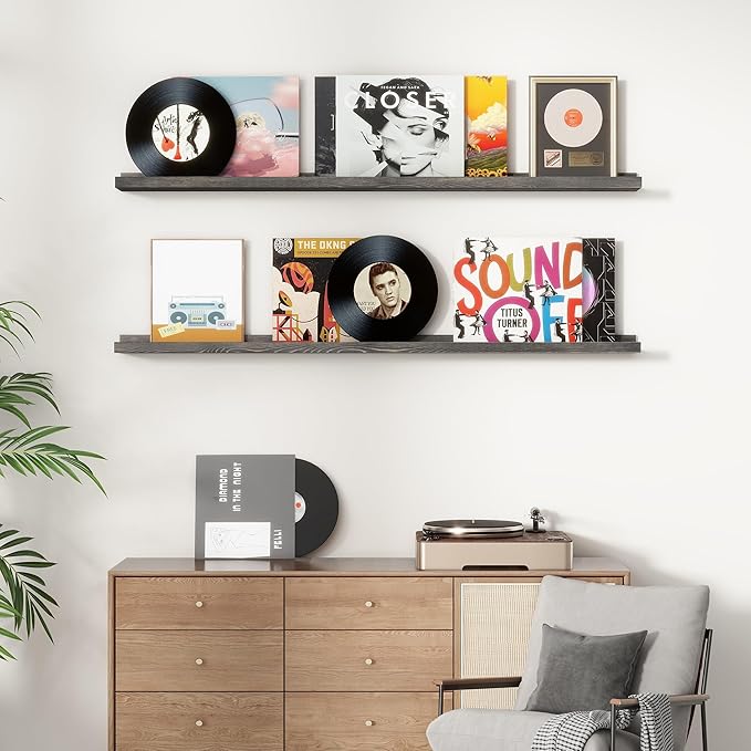 - Picture Ledge Shelves: The ledge in front of the wall shelves could prevent your precious items from falling off. And we handcraft a shallow groove on each book shelf to protect your items from sliding forward. Each floating shelf is 5 inches in depth with a 1.25 inches lip, you can put photos, pictures, DVD players, videos, books, toys, and some other knickknack on this beautiful display wooden shelf