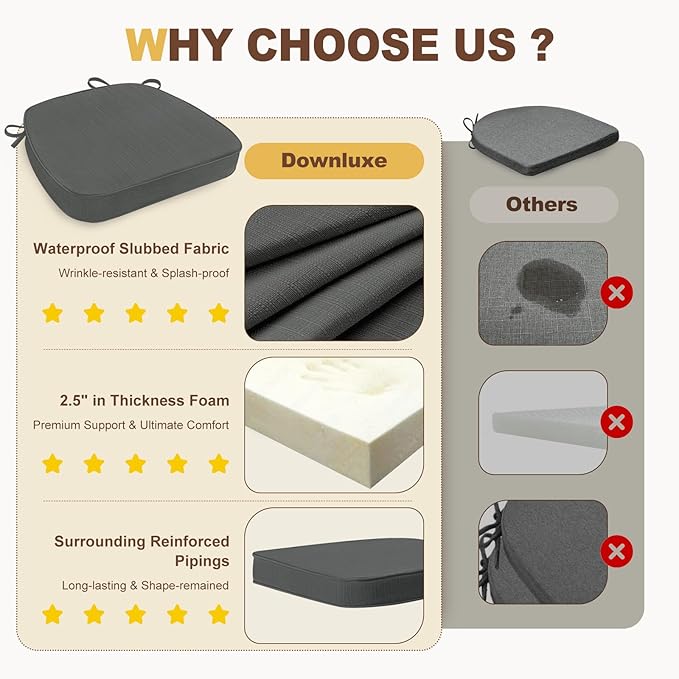 downluxe Chair Cushions for Dining Chairs, Waterproof Kitchen Chair Pads, Non-Slip Dining Seat Cushion with Ties, 17" x 16" x 2.5", Dark Grey, 6 Pack
