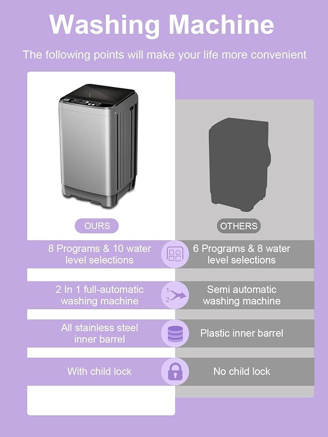 - 👗【Water Level and Mode Control】: 10Programs for choosing: wash-rinse-spin, soak-wash-rinse -spin, wash, wash-risne, rinse-spin, spin. You could adjust the different washing mode through the wash push-button and control the water level via the switch. Different clothes have different washing and water level requirement. You can stop wasting hours keeping an eye on washing machine for its full automatic clean mode.