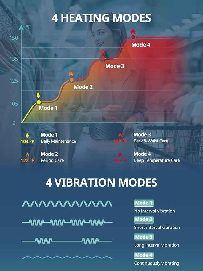 - Enhanced Heat and Vibration Therapy: With 4 vibration modes and 4 heat settings, this cordless heating pad lets you customize your comfort at the touch of a button. For optimal results, it's recommended to wear the pad over clothing.