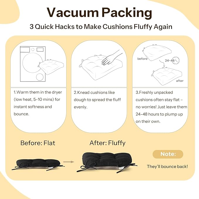 - Large Size Design: Our kitchen chair cushions set of 4 measures 18" x 18" x 3", perfect for most dining chairs, kitchen chairs, and office chairs, instantly transforming hard seats into cozy, stylish seating solutions for any room. The chair cushions for dining chairs are vacuum-packed for shipping. Upon receiving them you can simply follow the easy steps to fluff it for optimal comfort.