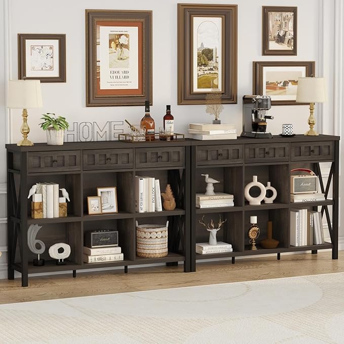 FATORRI Rustic 6 Cube Storage Organizer Bookshelf with 3 Drawers, Short Low Horizontal Bookshelf for Living Room, Industrial Wood and Metal Cubby Bookcase for Home Office (Walnut Brown, 47 Inch)