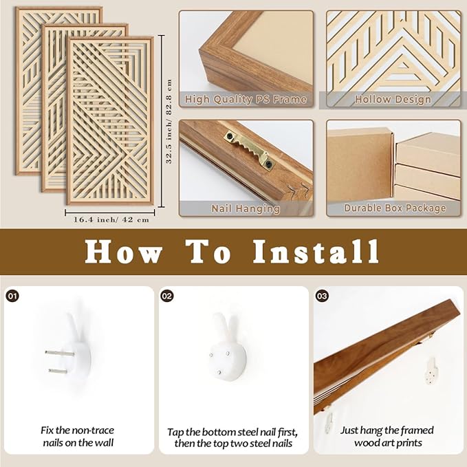 - 【Size for Easy Displaying】This set of modern minimalist wood wall art is about 16*32 inches. On the back of the minimalist art wall decor, sawtooth hooks have been installed in advance, and the packaging box is equipped with straight seamless nails and anti-collision particles. So you can easily hang or disassemble the mid century modren wall decor framed, very easy to operate.