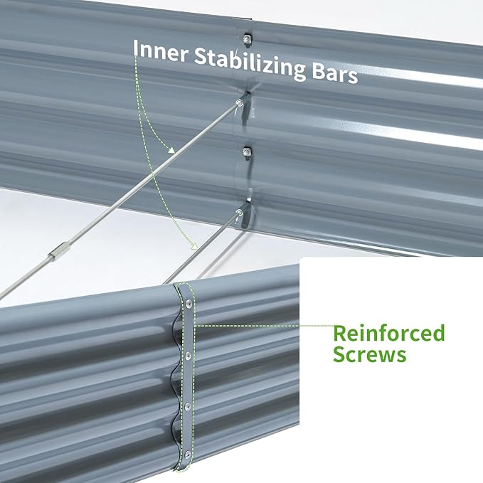 - Brighten your backyard: Environmentally friendly paint used meanwhile will not pollute the soil and provides a favourable growth environment for plants with our planter garden box. The steel support bars help the metal garden bed keep their shape, preventing warping and soil leakage over time.