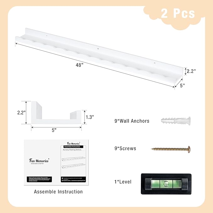 - 【Large Storage Space Nursery Shelves】Enhance your nursery space with these versatile floating ledge shelves. Kids can effortlessly store books, toys, stuffed animals, and games on these wall-mounted shelving units. Each nursery wall shelf measures 48×5×2 inches, and this set includes two packs for added convenience.