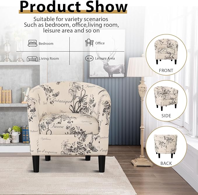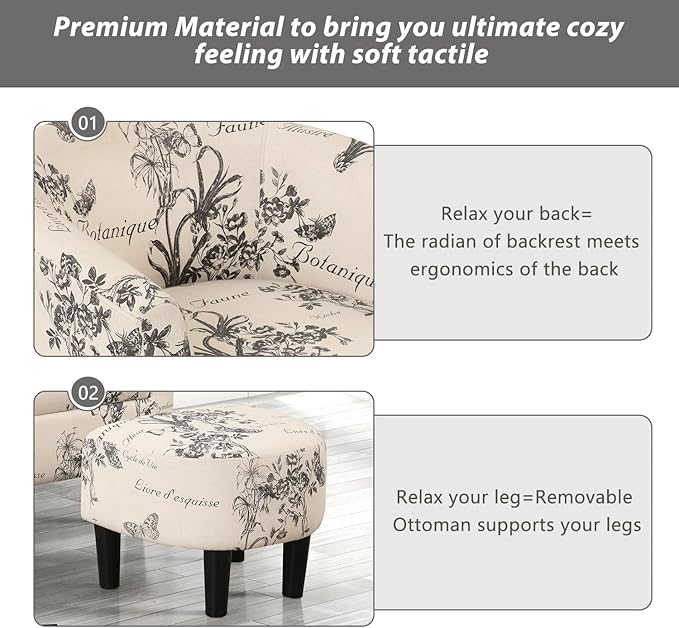- 【Accent Chair with Ottoman】- Our barrel chair equipped with a soft ottoman. You can rest your feet on it to experience the ultimate enjoyment and sleeping. The ottoman also can be used as stool alone.