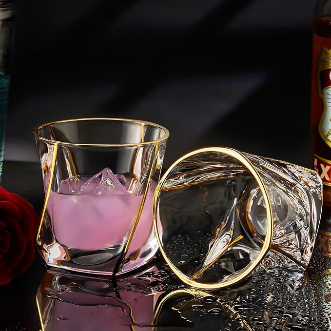 Crystal Whiskey Glasses Set of 2 with 24K Gold Rim,Bar Glasses,Twisted Whiskey Glass Gold Collection for Bourbon,Scotch and Wine,Rock Barware for Men Gift - 8oz