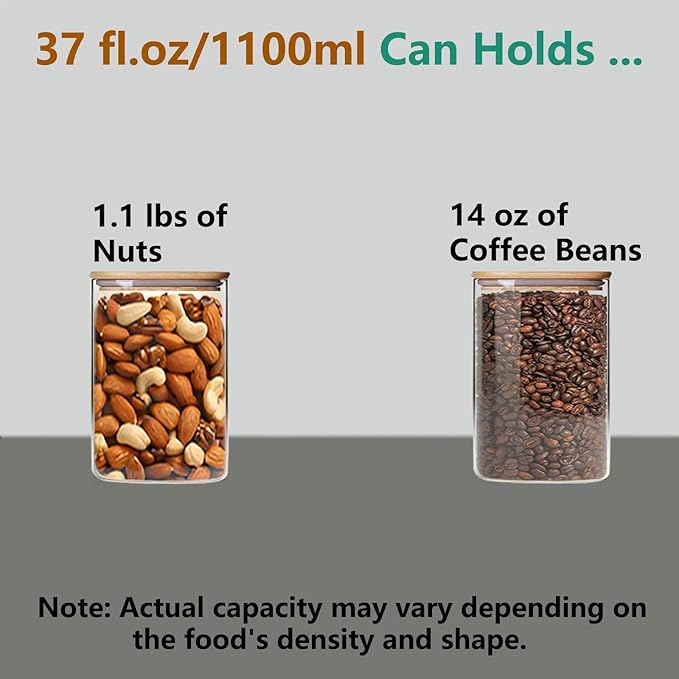 - [Safe to Use] The airtight canisters set is made of food-grade high borosilicate glass, lead-free, non-toxic. The lid is made from natural bamboo, adding an aesthetic touch to practicality. The glass is dishwasher-safe, but we recommend handwashing the lid for optimal care.