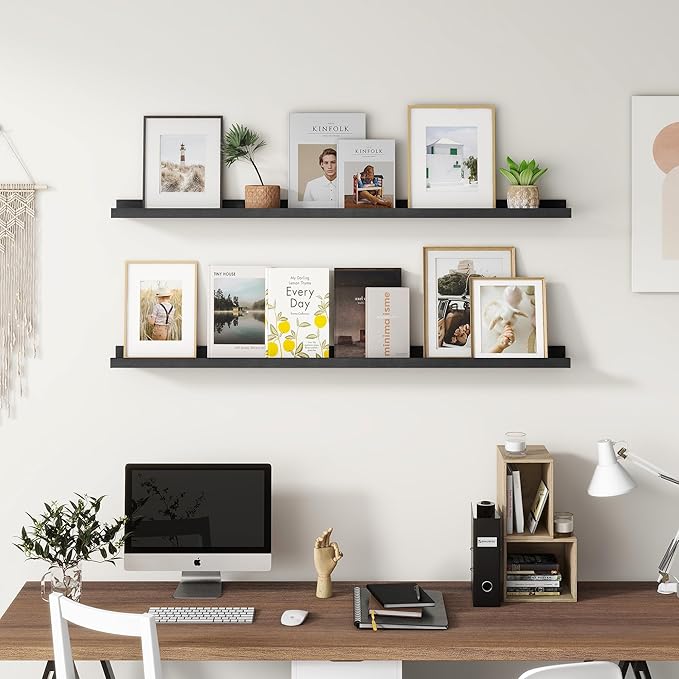 Picture Ledge Shelf, Floating Shelves Set of 2, Solid Pine Wood 55'' Long Large Nursery Book Shelves for Toys Storage, Kids Bookshelf for Living Room Bedroom Decor Books Photo Frames, Black