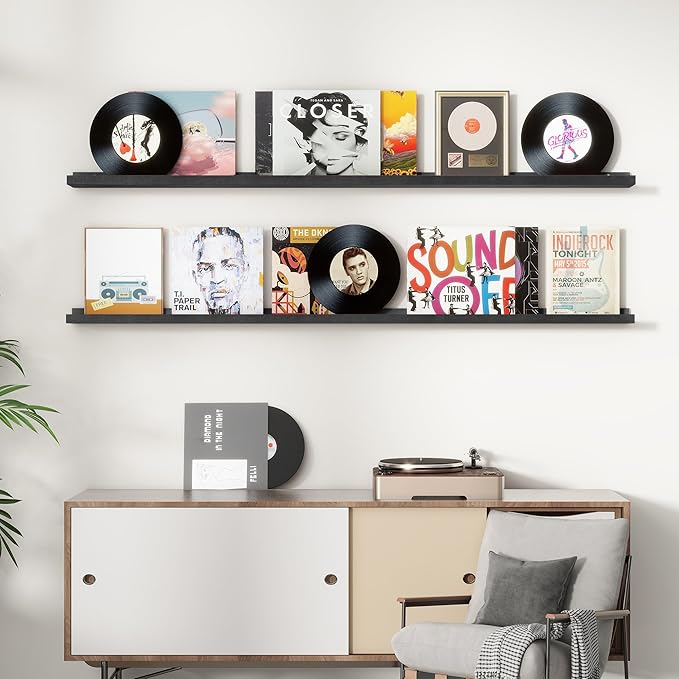 - Picture Ledge Shelves: The ledge in front of the wall shelves could prevent your precious items from falling off. And we handcraft a shallow groove on each book shelf to protect your items from sliding forward. Each floating shelf is 5 inches in depth with a 1.25 inches lip, you can put photos, pictures, DVD players, videos, books, toys, and some other knickknack on this beautiful display wooden shelf