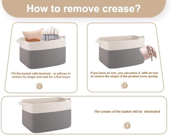 - Washable Woven Storage Basket: This rope baskets for storage can be washed by hand or machine with gentle detergent. If machine washed, please put them into a laundry bag. NOTE: These large basket for blankets are folded when shipping, but it will turn back to its elegant shape quickly if you fill it with some towels or clothing, and iron is great idea to remove the creases