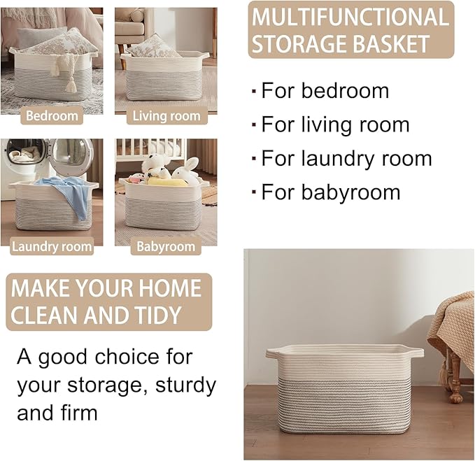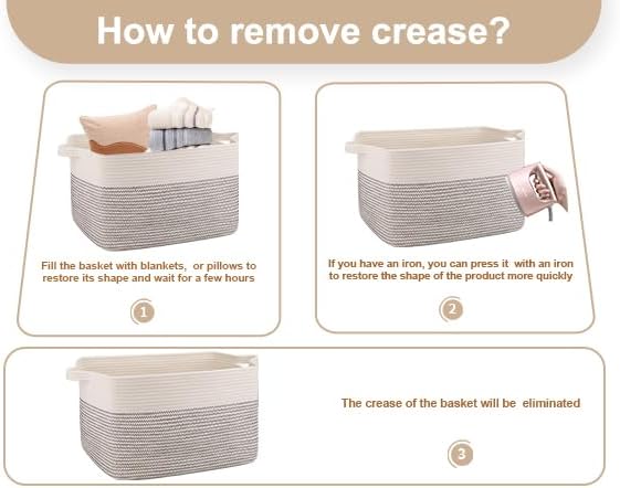 - Washable Woven Storage Basket: This rope baskets for storage can be washed by hand or machine with gentle detergent. If machine washed, please put them into a laundry bag. NOTE: These large basket for blankets are folded when shipping, but it will turn back to its elegant shape quickly if you fill it with some towels or clothing, and iron is great idea to remove the creases