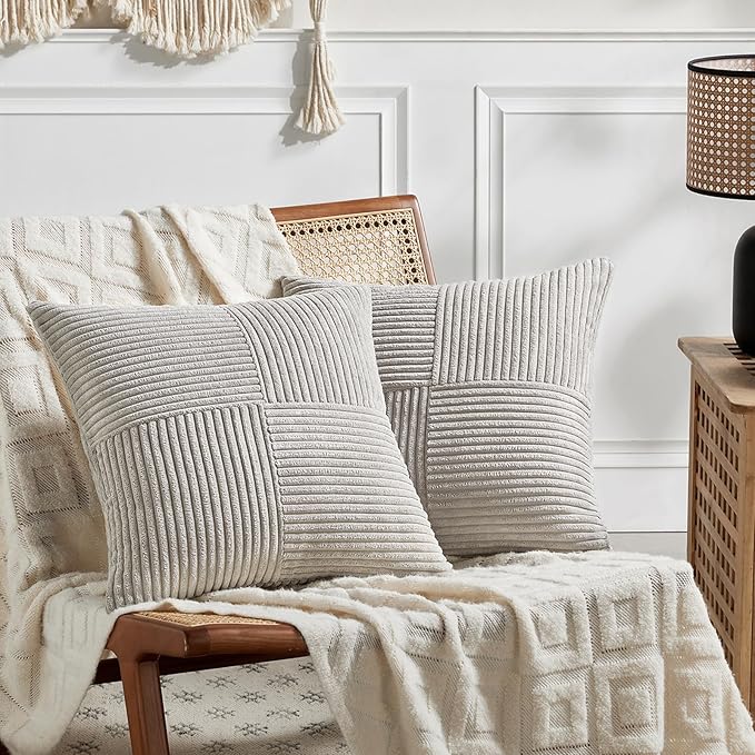 Fancy Homi 2 Packs Neutral Grey Euro Decorative Throw Pillow Covers 26x26 Inch for Couch Bed Sofa, Rustic Farmhouse Boho Home Decor, Soft Corss Corduroy Patchwork Textured Square Cushion Case 66x66 cm