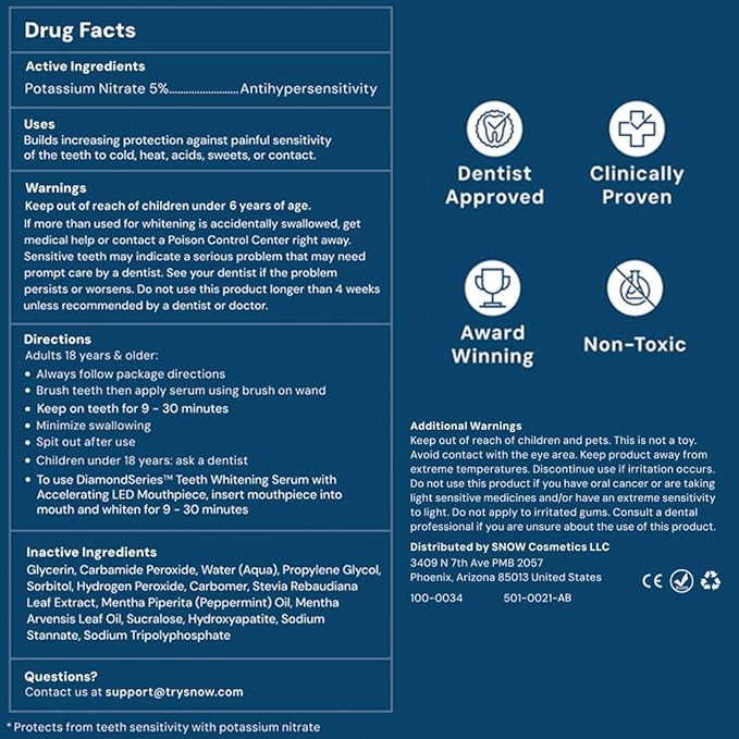 - [SNOW DENTAL CARE PRODUCTS]: Since 2017, SNOW has focused on designing innovative oral care products that deliver professional level results. SNOW offers a 60-day money-back guarantee.