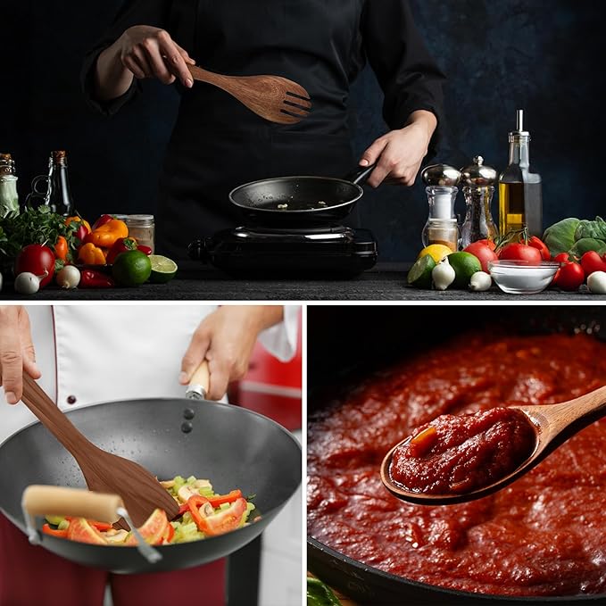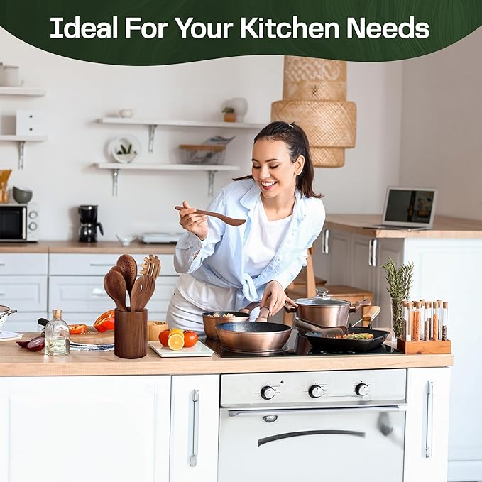 - [10 Piece Wooden Set] – Our wooden kitchen utensil set includes a Slotted Spatula, Salad Spoon, Mixing Spoon, Pasta Server, Salad Fork, Flat Spatula, Slotted Soup Spoon, Wok Spatula, Spoon rest and Set holder. Perfect for stirring, cooking, and serving