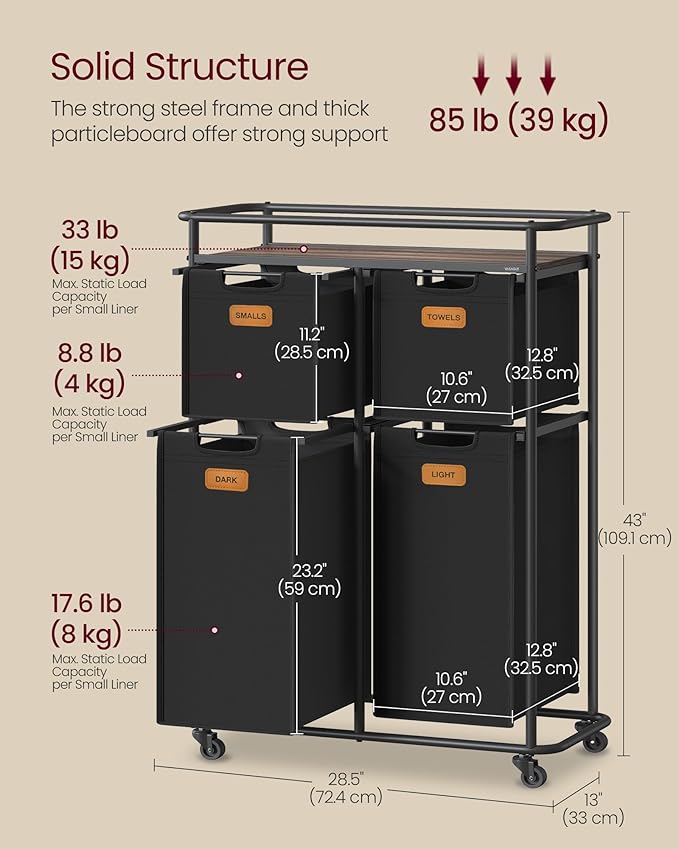 - 【PORTABLE LAUNDRY CART WITH REMOVABLE LINERS】With 4 casters, including 2 with brakes, this laundry sorter is easy to move and lock in place. The liners, equipped with hook-and-loop fasteners and convenient handles, are simple to remove and carry