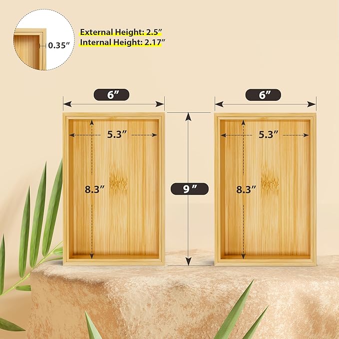 - Luxury Bamboo Drawer Organizer - The desk drawer organizer is made of bamboo, and the bottom are made from engineered wood board, which is more durable and sturdy than plastic. Each package comes with 2 piece bamboo drawer organizer, and the size of each drawer organizer is 9 x 6 x 2.5 inches. The bamboo drawer organizer certainly will help you store items and organize drawer in shelf/ closet/ cabinet/ dresser/ office neatly
