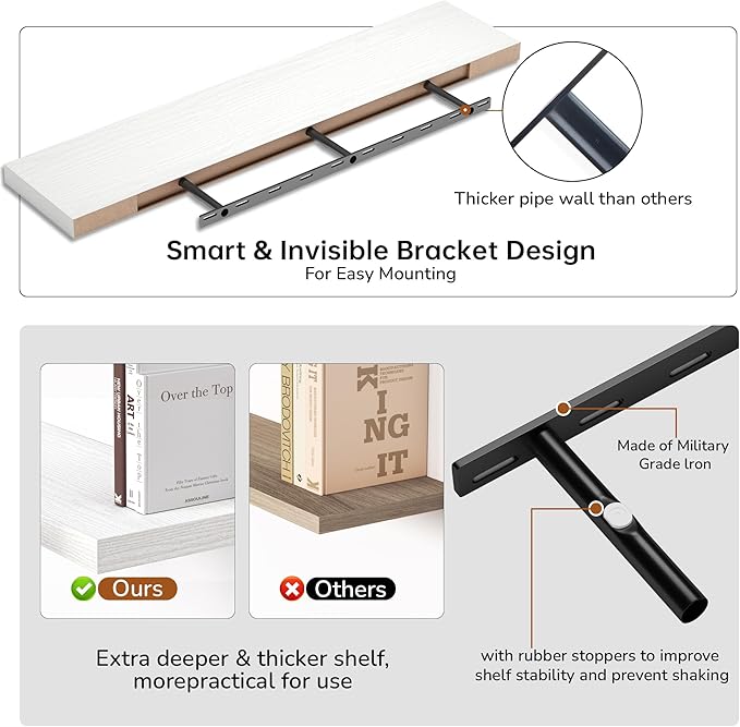 - Extra Deeper & Thicker - This wall shelf measures 48"W x 10.23"D x 1.8"H. Extra deeper and thicker design in order to bring maximizes storage space and weight capacity, even hold up to 75 lb. This floating shelf taking up zero square feet, reduces clutter and highlights décor in compact spaces.