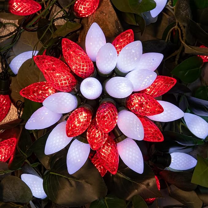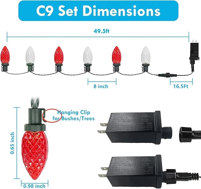 - C9 Led Christmas Lights for Outdoor & Indoor: Total length is 49ft, of which 33ft with lights. Super bright with new upgraded LED chips. These waterproof C9 Christmas string lights have red and white 50 LED bulbs to satisfy your diverse decorative effect.