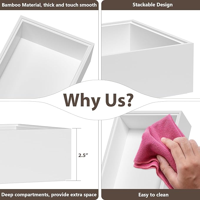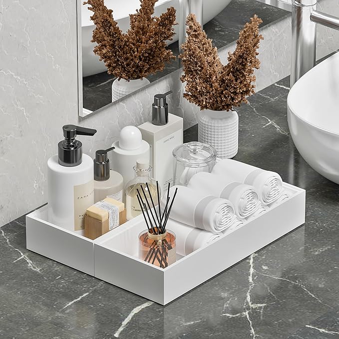 - Stackable and Deep Drawer Organizer Bins - Greatseas bathroom tray features 2.5" in height, which gives you more space to storage your guest towel, toilet paper roll, makeup and perfume. With groove design, our toilet paper storage basket can be stacked as needed. Its deep compartmentments and stackable design make it a practical storage box for drawers or even countertop, protecting your item from falling