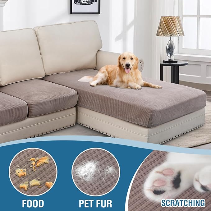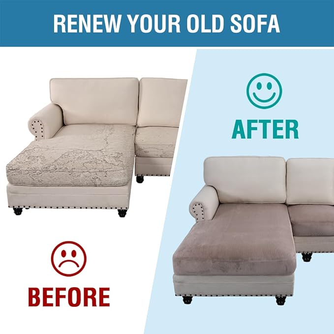 - INCREDIBLY COMFORTABLE VELVET: Products passed GLOBAL RECYCLED STANDARD certificate.This innovated stretch sofa slipcovers are constructed with 3 PIECES,including 1 Chaise cover and 2 individual cushion covers. Crafted from luxurious velvet plush fabric with unique striped cuts, feature thick, soft, smooth, anti-wrinkle, no fading, durable as well as highly stretch. Protect your cushion furniture from daily wears and tears, stains, kids, scratches from pet claws, dogs or accidental spills