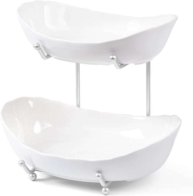 HBlife Fruit Bowl for Kitchen Counter - 2 Tier Ceramic Fruit Bowl with Metal Stand, Tiered Fruit Basket for Kitchen Counter, Serving Platters Serving Trays for Party