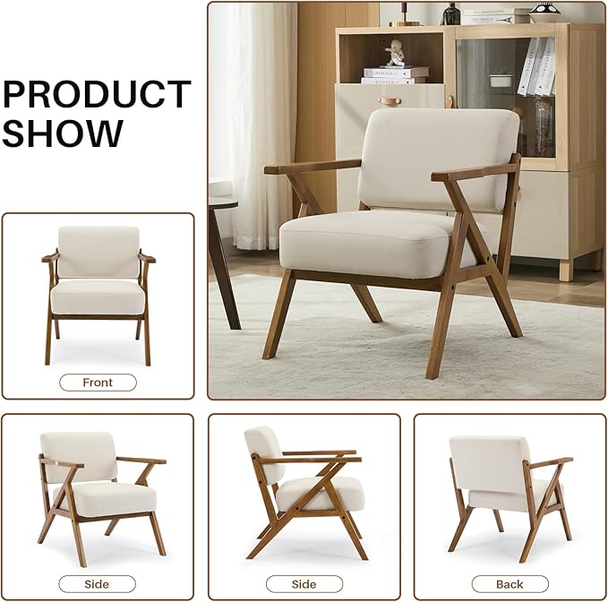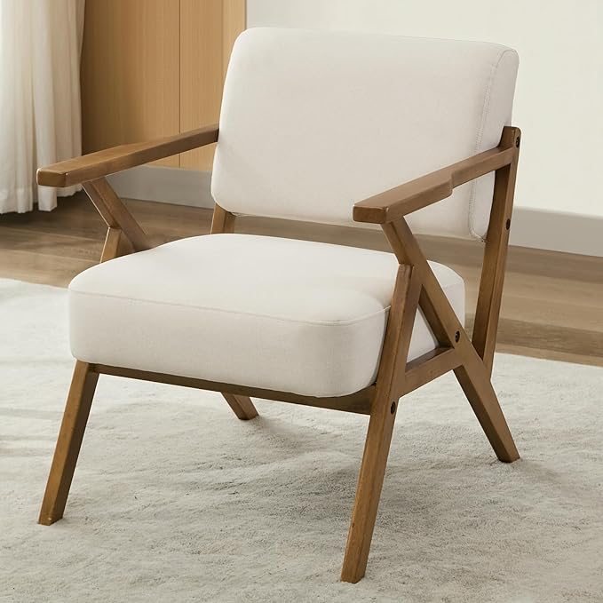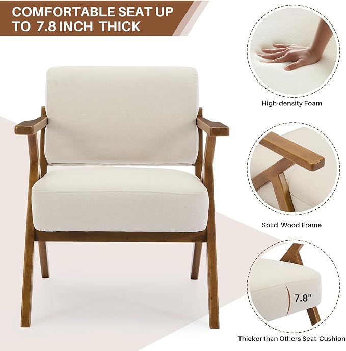 Mid-Century Modern Chair Upholstered Lounge Arm Chair with Solid Wood Frame Thicker Cushion for Living Room, Reading, Balcony, Beige Linen