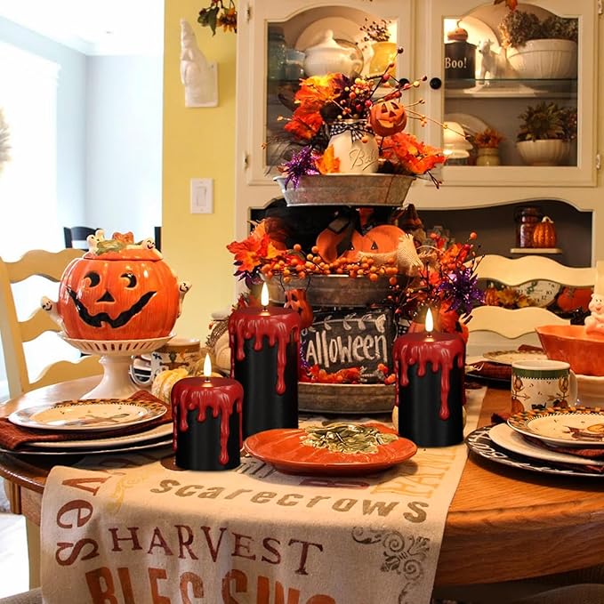 - Unique Halloween Candles: Blood dripping effect on each Black LED candles top, vivid appearance with warm yellow light 3d wick create a warm and horror Halloween atmosphere in your room everywhere.
