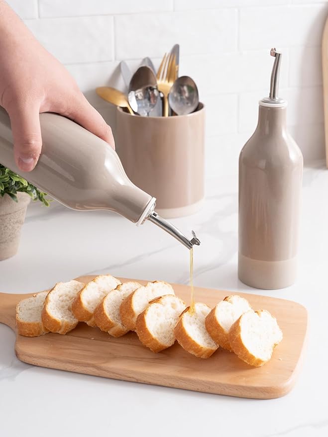 - ELEGANT OLIVE OIL DISPENSER BOTTLE - Our ceramic oil dispenser is handmade and batch fired at extremely high temperatures, forming a smooth glaze and providing a resilient surface for strength and durability, easy to clean and dishwasher safe for long-term use