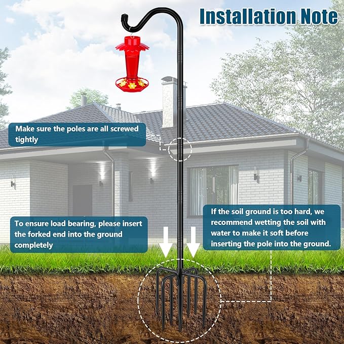 - 【INSTALLATION NOTES】Please tighten each connecting rod to ensure structural stability. Shepherds hooks are suitable for soil ground, if the soil ground is too hard, we recommend wetting the soil with water to make it soft before inserting the pole into the ground. You can either step on the 7 prongs base with your foot or use a rubber hammer to insert it into the ground. To keep from damaging the 7 prongs base, please do not hit it with a metal hammer when inserting it into the ground. Please insert the forked end into the ground completely to ensure load bearing