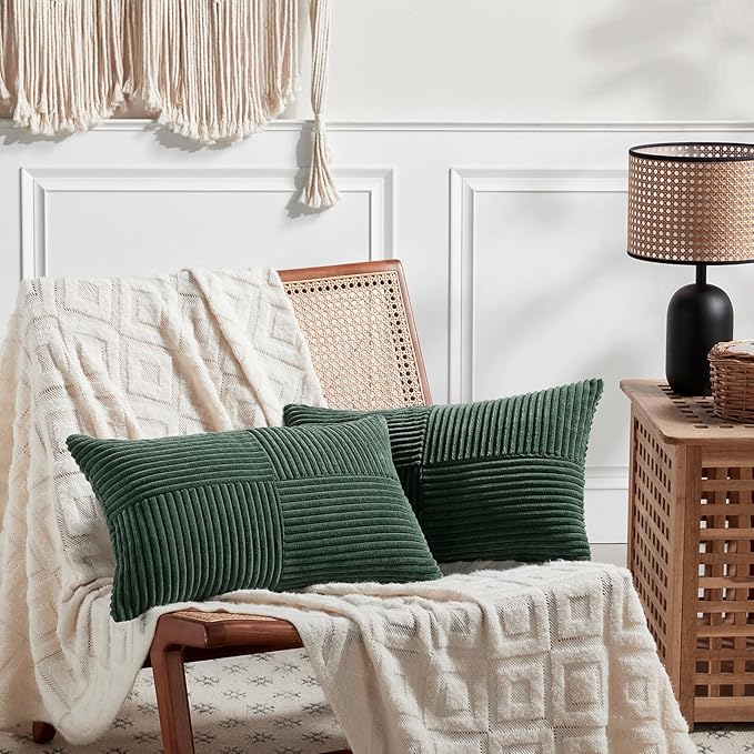 Fancy Homi Set of 2 Dark Green Long Lumbar Decorative Throw Pillow Covers 12x24 Inch for Living Room Couch Bed, Boho Farmhouse Forest Green Home Decor, Soft Corduroy Corss Textured Cushion Cas