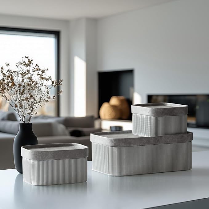 - TIMELESS STORAGE WITH A SUSTAINABLE TWIST: Crafted in sleek storm grey, this storage box set offers modern elegance and eco-friendly design. The sturdy MDF interior and luxurious vegan leather exterior provide a stylish, sustainable storage solution for contemporary homes